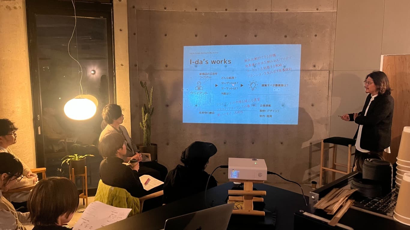 記念すべき初回には、株式会社イーダの佐藤フミシゲ氏が講師として登壇。デザイナーに求められるマーケティング理論や必要なスキルについて基調講演を行い、参加者に新たな視点の提供を行いました。