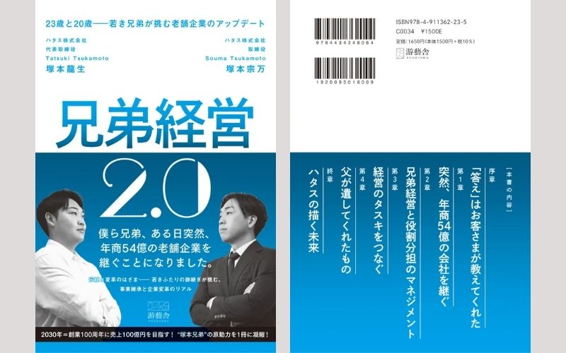 建設・不動産業のハタス株式会社(愛知県刈谷市、代表取締役社長:塚本龍生)は、代表取締役社長の塚本龍生(25歳)と取締役の塚本宗万(22歳)による共著書籍『兄弟経営2.0 -23歳と20歳—若き兄弟が挑む老舗企業のアップデート-』を2025年11月30日に発売いたします。現在Amazonにて予約受付中です。本書は、創業95年・年商54億円の老舗企業を、突然の事業継承で引き継いだ若き兄弟経営者の2年間の軌跡を赤裸々に綴った経営実録書です。