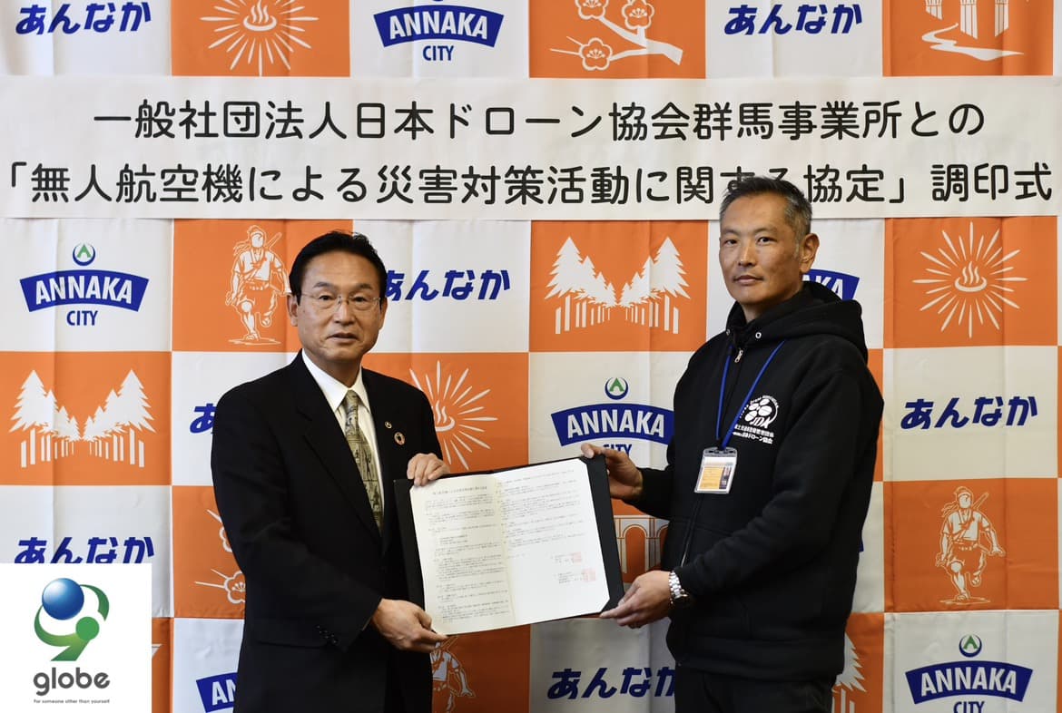 株式会社globeコーポレーションが法人会員を務める日本ドローン協会 群馬事業所(所在地:群馬県前橋市、所長:荒川 智)は群馬県安中市と災害対策に関する協定の締結を行いました。