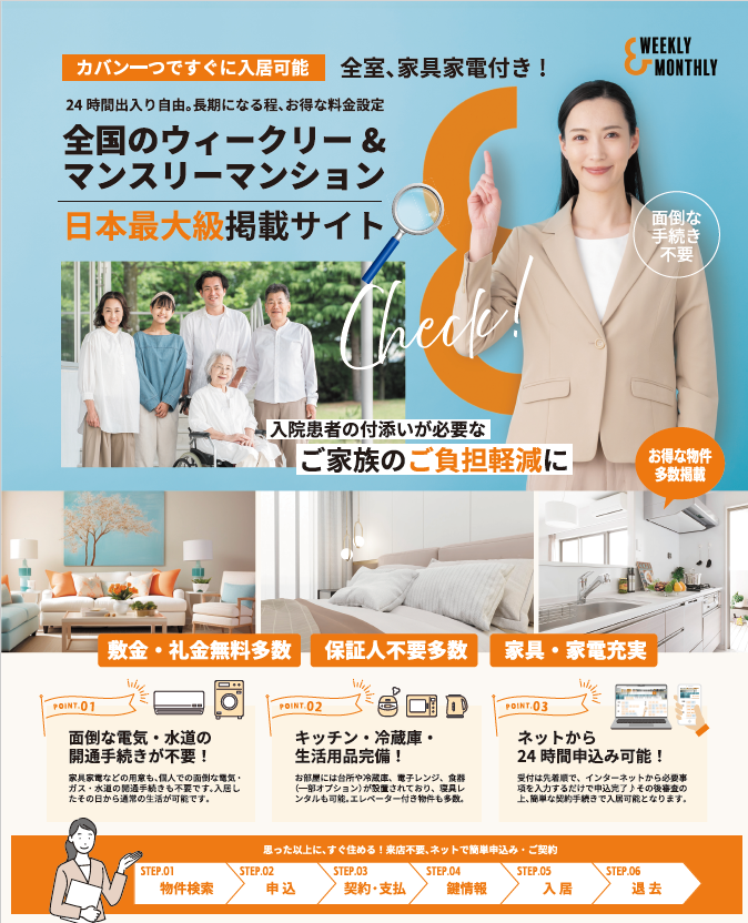 全国のウィークリー・マンスリーマンション総合情報サイト「W&M(ウィークリー&マンスリー)」を運営するWeekly&Monthly株式会社(本社:北海道札幌市北区、代表取締役:黒木 健次郎)は、入院医療費保証サービス『ナップメディカル』を提供するナップ賃貸保証株式会社と連携し、入院や通院で付き添いが必要な方々に向けて、“短期住宅”という新しい選択肢を全国の医療機関を通じて継続的に発信しています。