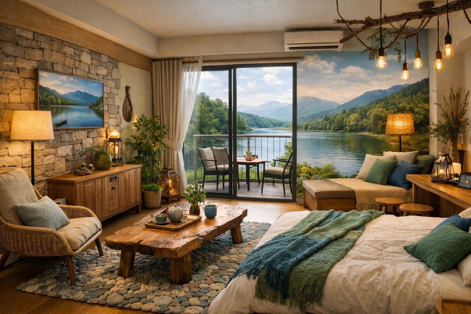 支笏湖や千歳川の水景と森の静寂を、アースカラーや自然素材を用いて室内に再現。北海道千歳市を訪れる出張者らが心身をリセットできる「暮らすような滞在」を目指す、自然の温もりに満ちた安らぎのコンセプトです。