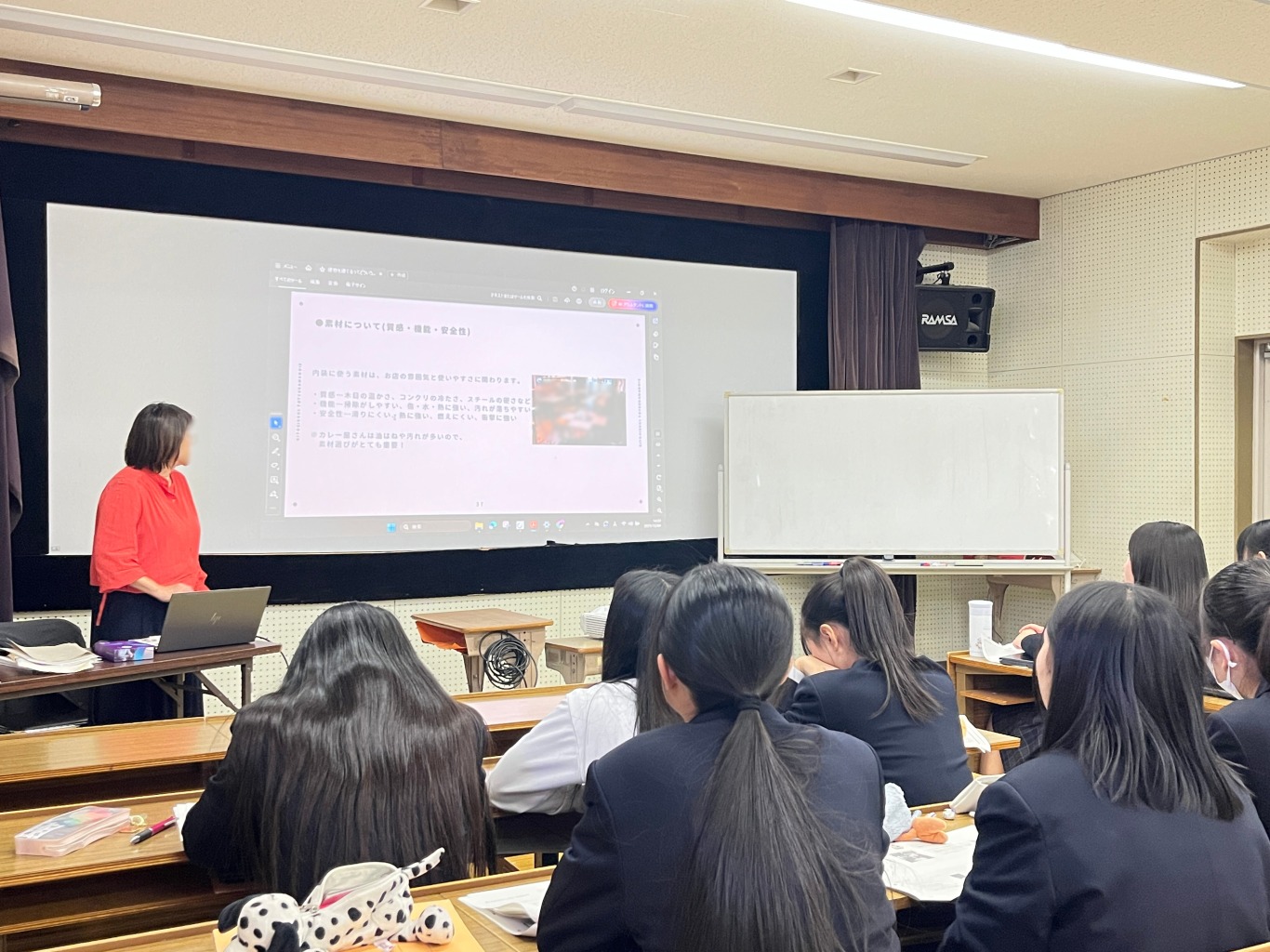 当日の授業では、当社の設計士とインテリアコーディネーター(以下:IC)が登壇し、建物づくりの流れや空間デザインの考え方を、実例を交えながらわかりやすく解説しました。