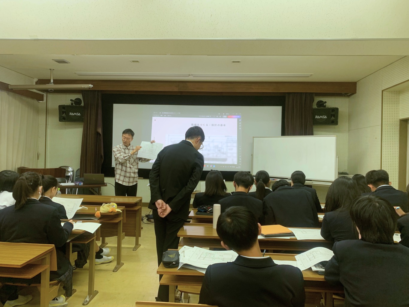 設計士から、生徒たちに「建物はどのような順序でつくられるのか」「間取りはどんな視点で考えるのか」といった基礎知識を紹介。図面の読み方、用途に合わせた動線のつくり方、素材選びのポイントなど、普段触れることのない“設計の裏側”を丁寧に説明しました。