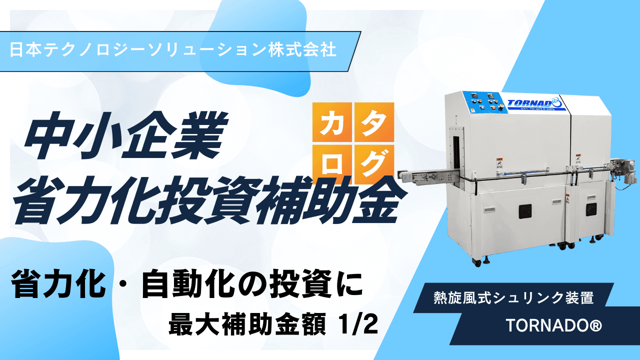 日本テクノロジーソリューション株式会社(本社:兵庫県、代表取締役社長:岡田耕治)が製造・販売する「熱旋風式シュリンク装置 TORNADO®」が、経済産業省・中小企業庁が推進する「中小企業省力化投資補助金(カタログ型)」の対象製品として採択・掲載されました。