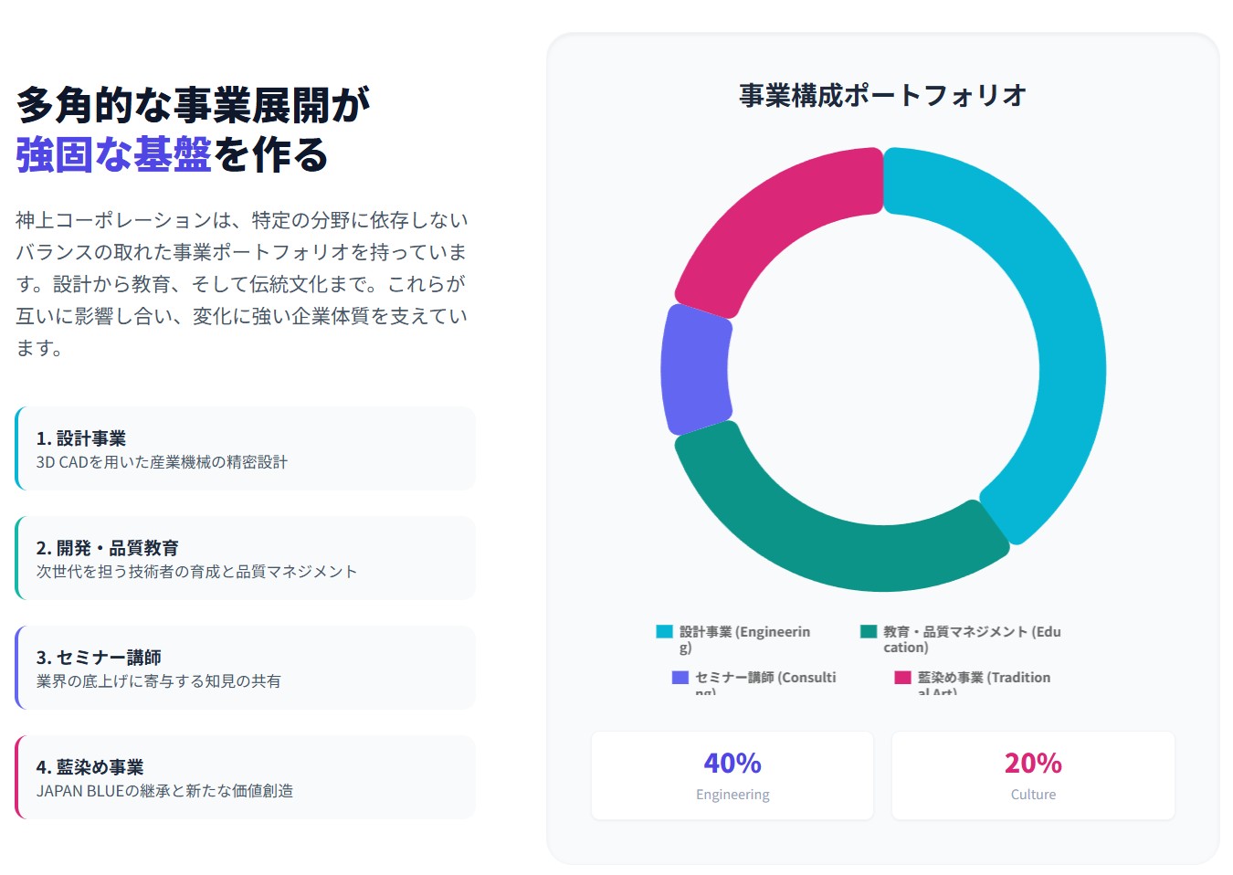 神上コーポレーションは、「論理・設計(左脳的アプローチ)」と「感性・文化(右脳的アプローチ)」を高度に融合させることで、競合他社には真似できない独自のソリューションを生み出し続けてきました。