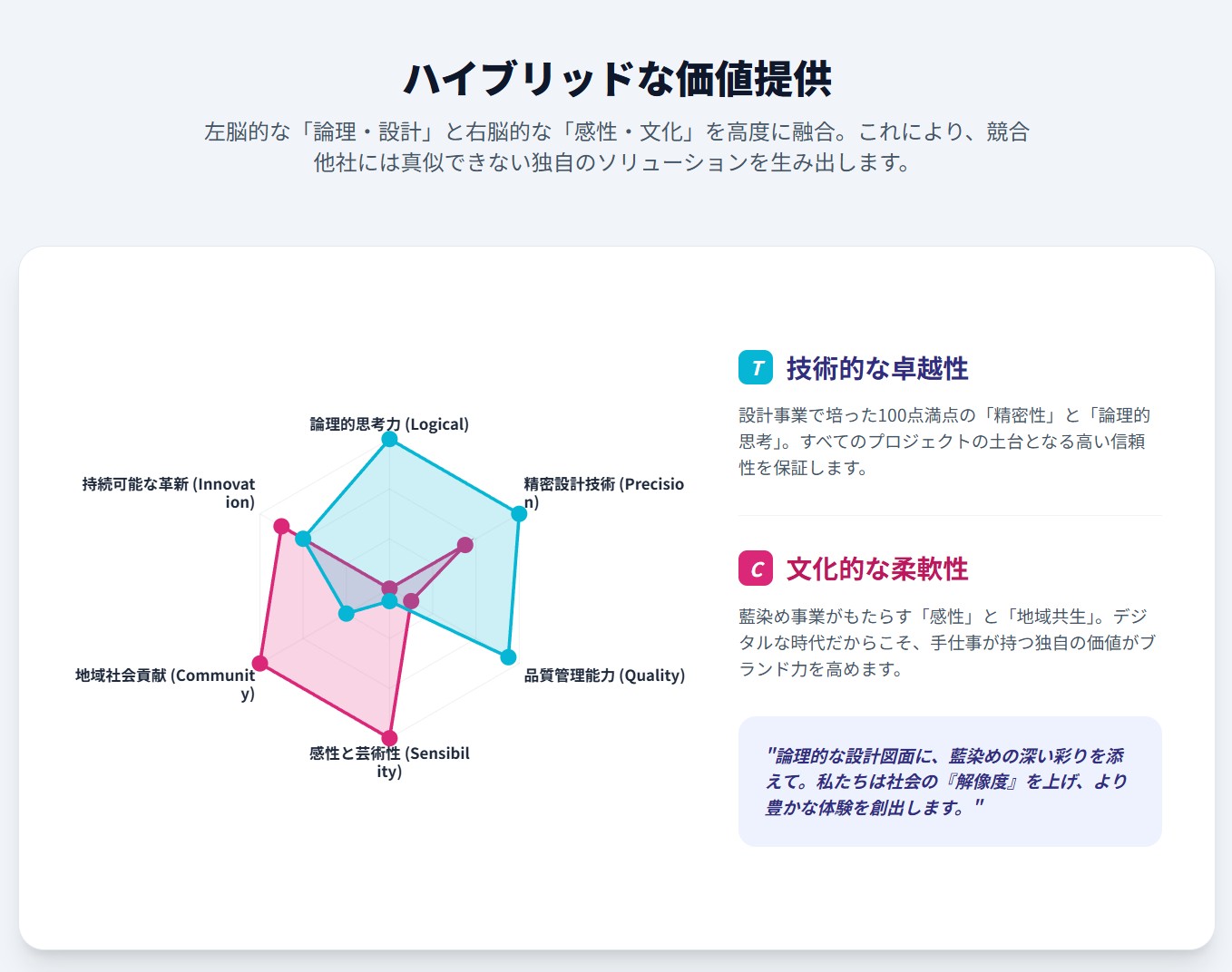 当社は、デバイス、モジュールや産業機械の精密設計と、伝統文化である「藍染め」事業を融合させた独自の「ハイブリッド経営」を推進しています。