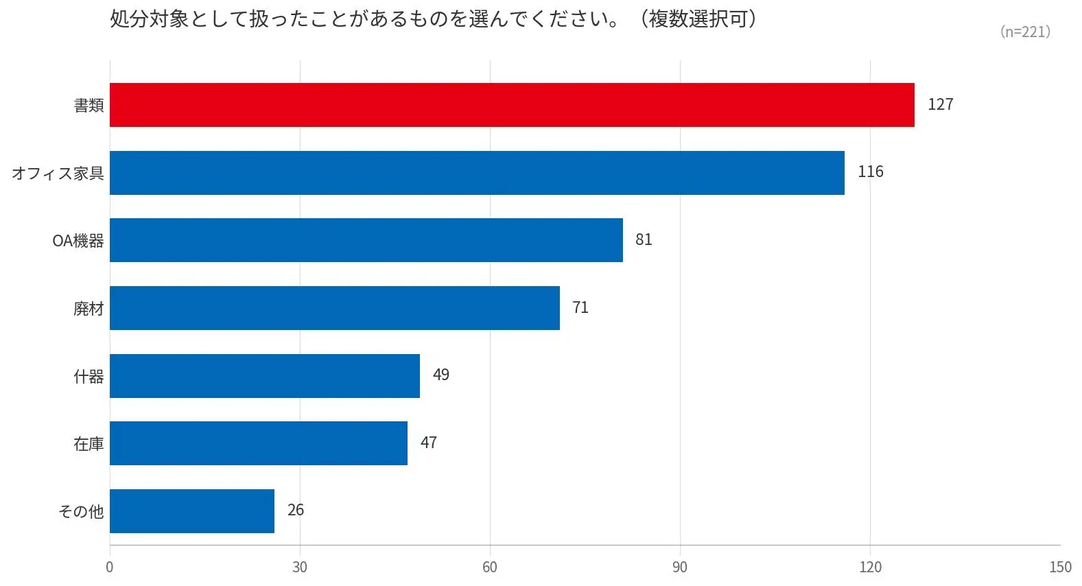 処分対象として扱ったことがあるものを複数回答で尋ねたところ、「書類」が127件(57.5%)で最多となり、次いで「オフィス家具」が116件(52.5%)と、過半数の担当者が経験していることがわかりました。「OA機器」は81件(36.7%)、「廃材」は71件(32.1%)と続き、オフィスで発生する廃棄物の多様さが浮き彫りになりました。