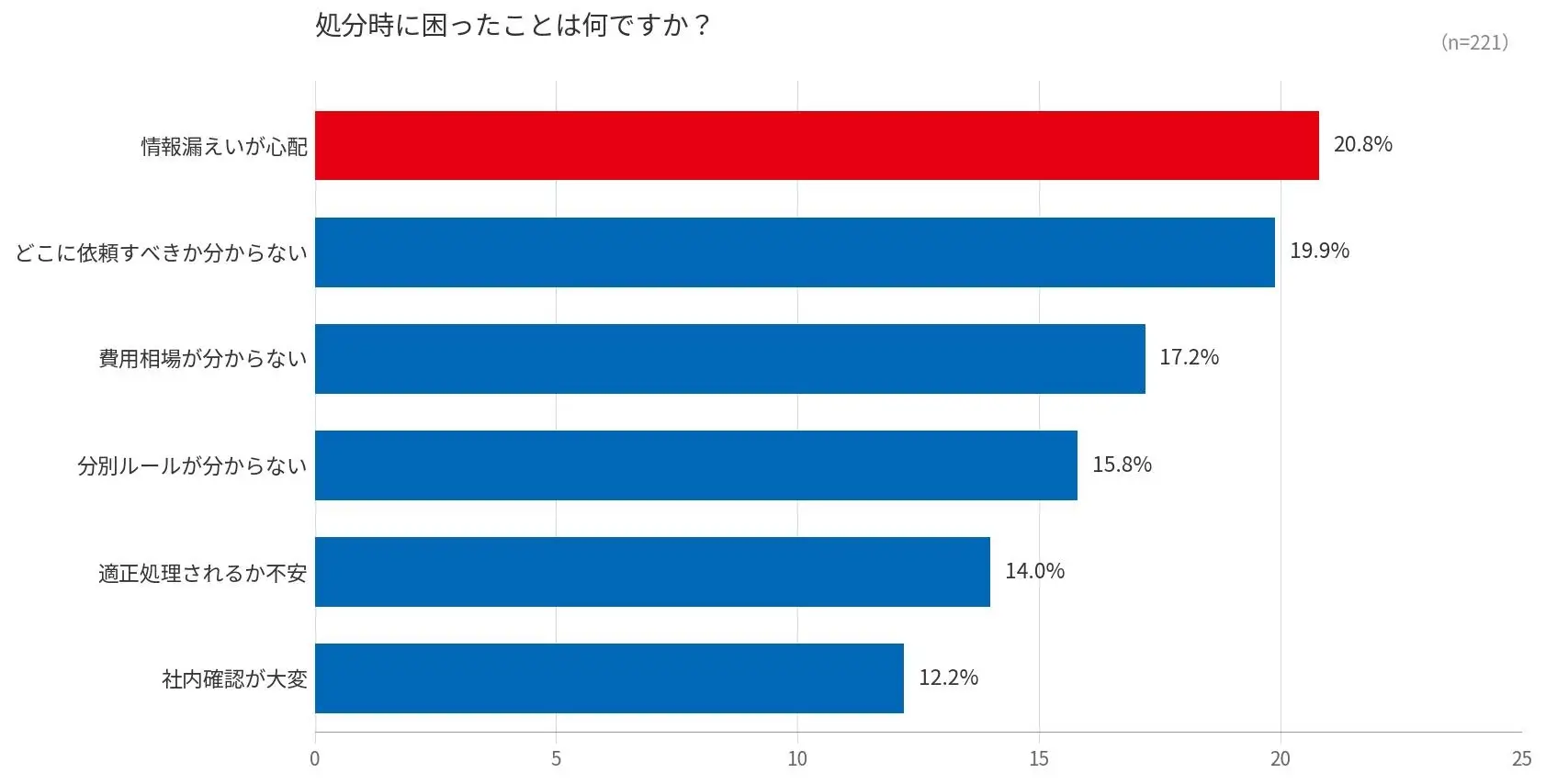 処分時に困ったことに関しては、「情報漏えいが心配」が20.8%でトップとなりました。「どこに依頼すべきかわからない」(19.9%)、「費用相場がわからない」(17.2%)が続き、「何がわからないかわからない」状況に置かれている担当者像が浮かびます。