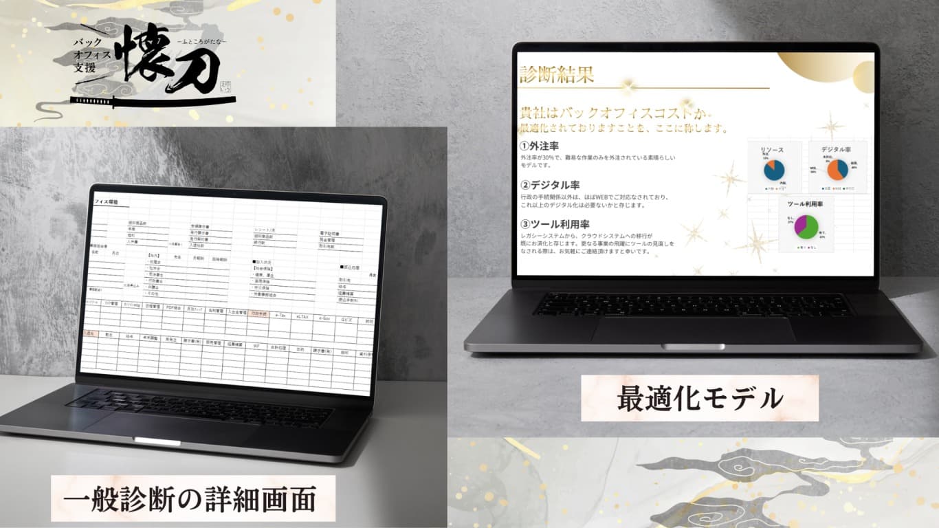 そして『バックオフィスコスト診断』でどの部分にどのくらいコストがかかっているのかを明確にしたうえで、その結果をもとに改善策を提供するのが弊社のもうひとつのサービス「懐刀」です。
