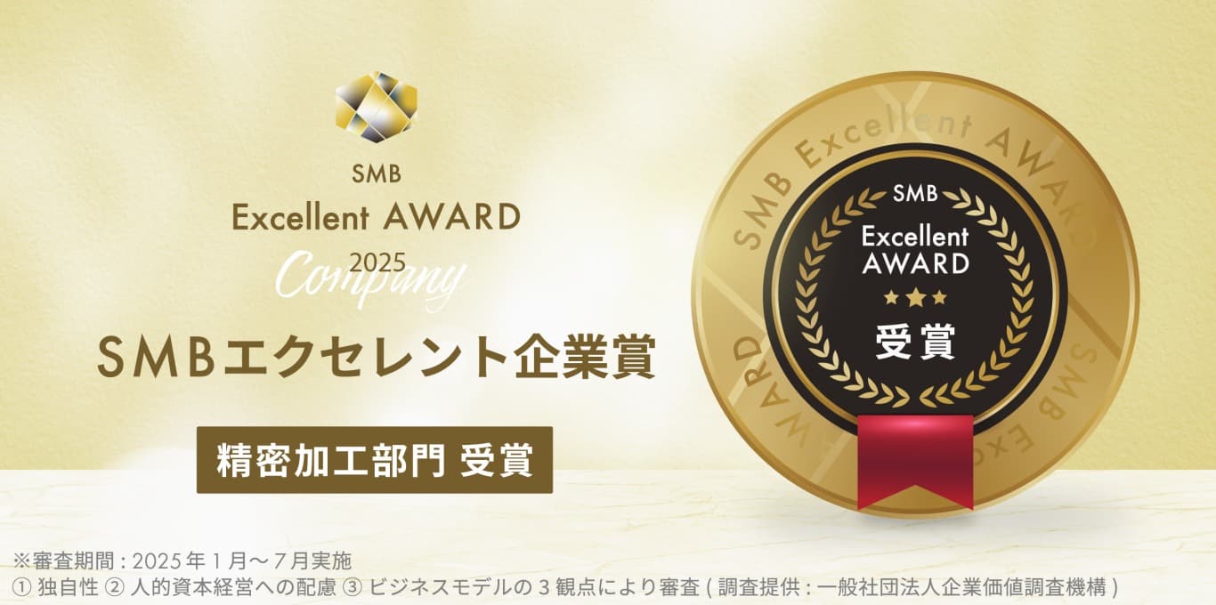 このたび弊社は、一般社団法人企業価値調査機構が主催する「2025年度SMBエクセレント企業賞」において、精密加工部門での優れた取り組みと実績が評価され、「精密加工部門賞」を受賞いたしました。