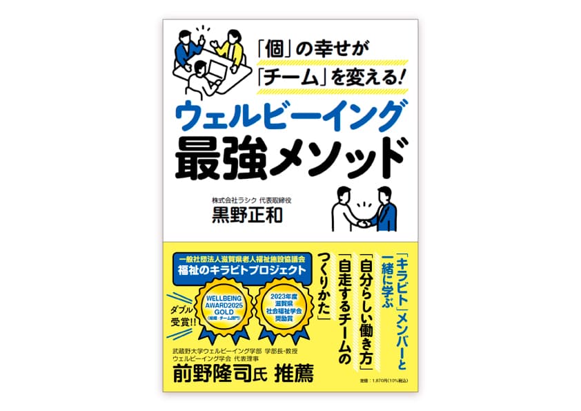 株式会社ラシク(本社:京都府京都市、代表取締役:黒野正和)は、当社の人財育成コンサルティング支援のもと、一般社団法人滋賀県老人福祉施設協議会が実施する「福祉のキラビトプロジェクト」が「ウェルビーイング・アワード2025 組織・チーム部門」でゴールドを受賞したことを受け、この成功事例をまとめた書籍『「個」の幸せが「チーム」を変える!ウェルビーイング最強メソッド』(PHPエディターズ・グループ)を2025年9月30日に発売したことをお知らせします。