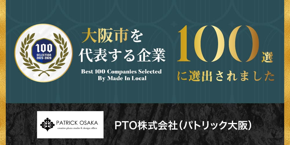 ヘアメイク&フォトスタジオ PATRICK OSAKA(運営:PTO株式会社/所在地:大阪市、代表取締役 小倉毅寛)は、 このたび「大阪市を代表する企業100選(Best 100 Companies Selected by Made In Local)」に選出されたことをお知らせいたします。「100枚→150枚納品ボリュームアップ」 特別キャンペーンを2026年1月から2026年12月の期間限定で実施いたします。