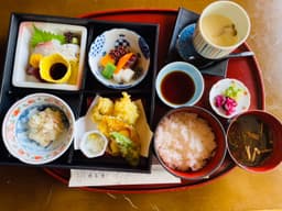 メインのほかにも、日替わりのお惣菜メニュー、ごはん、あおさのお味噌汁、お茶、サラダ、デザート一品がついています!