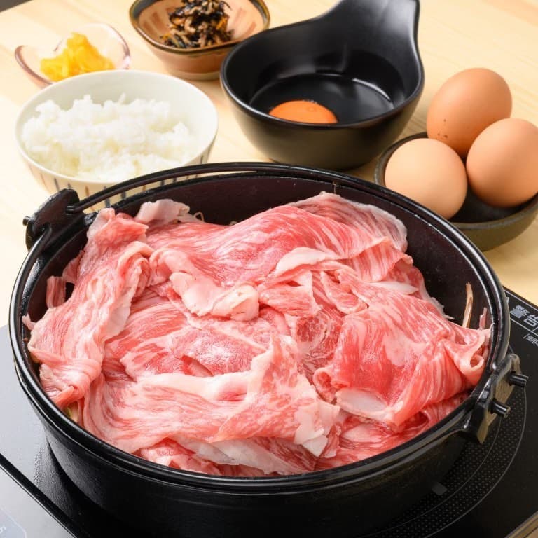 今回は、お肉のほかに「小鉢、漬物、卵、ご飯食べ放題」がついてくる「すき焼き牛」と「すき焼き鶏」のそれぞれのセットをご紹介します!