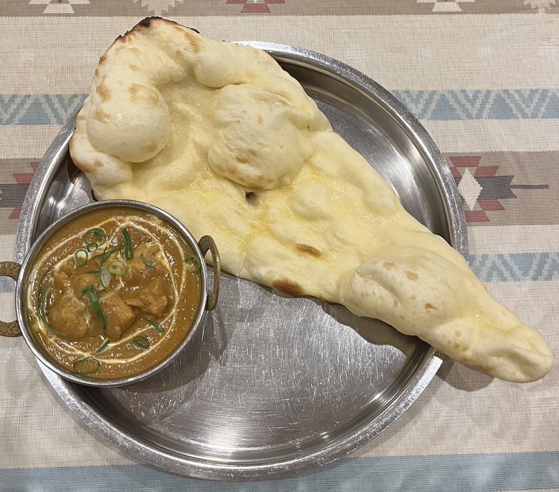 また、表面に少しだけ塩味🧂があります。ナンの真ん中あたりに少し油がのっていて、そこが特に塩味があって、そのままでもおいしく食べられるな、と感じました。
