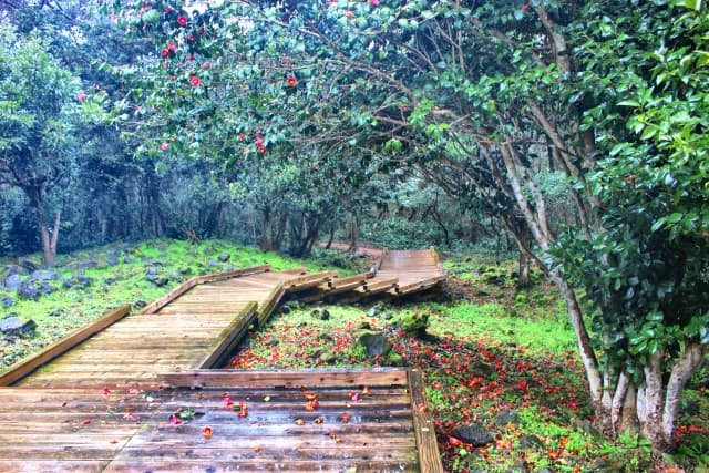 笠山の北端には、東京ディズニーランド約2個分に相当する約10ヘクタールにわたって、2万5000本のヤブツバキが生息する椿群生林があります。