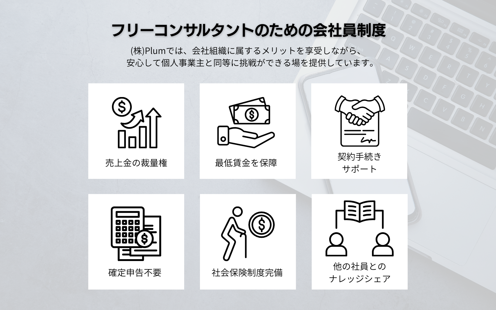 弊社では、コンサルタントの中途採用を随時行っています。特に、将来的に独立を志向されている方、またはすでに独立して活動されている方を歓迎しています。独立には、裁量を持って自由度高く働ける魅力がある一方で、各種手続きやバックオフィス業務など、負担も少なくありません。弊社では、そうした負担を会社が引き受けることで、コンサルタントが本来の価値提供に集中できる環境を整えています。