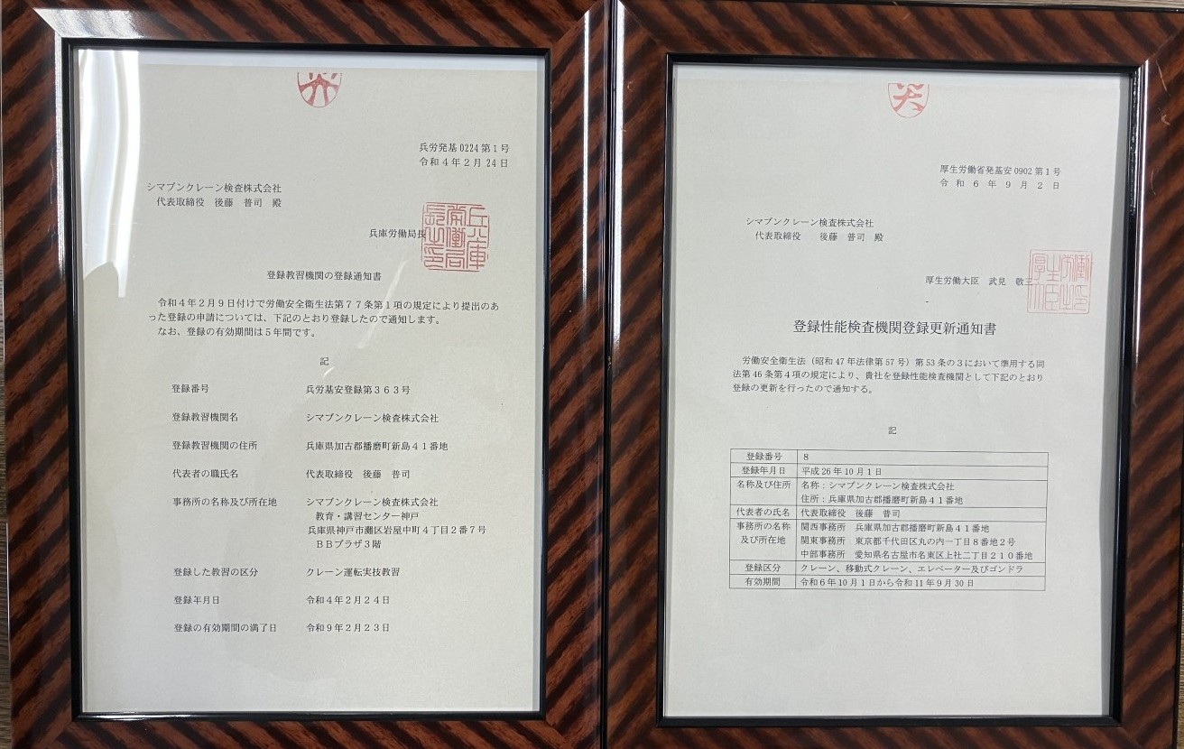 2000年にクレーン等性能検査事業を民間委託に規制緩和する方針が打ち出され、弊社は参入すべく着手しました。その後、2003年に厚生労働省よりクレーン、移動式クレーンの性能検査代行機関指定書が交付され、兵庫県及び大阪府内で性能検査事業を開始しました。更なる拡大を目指し、関東事務所等を開設し全国各地で性能検査を実施できる体制を整えた事で、年間検査台数18,000台及びクレーンおよび移動式クレーンの分野でシェア率は19%に到達しました。
