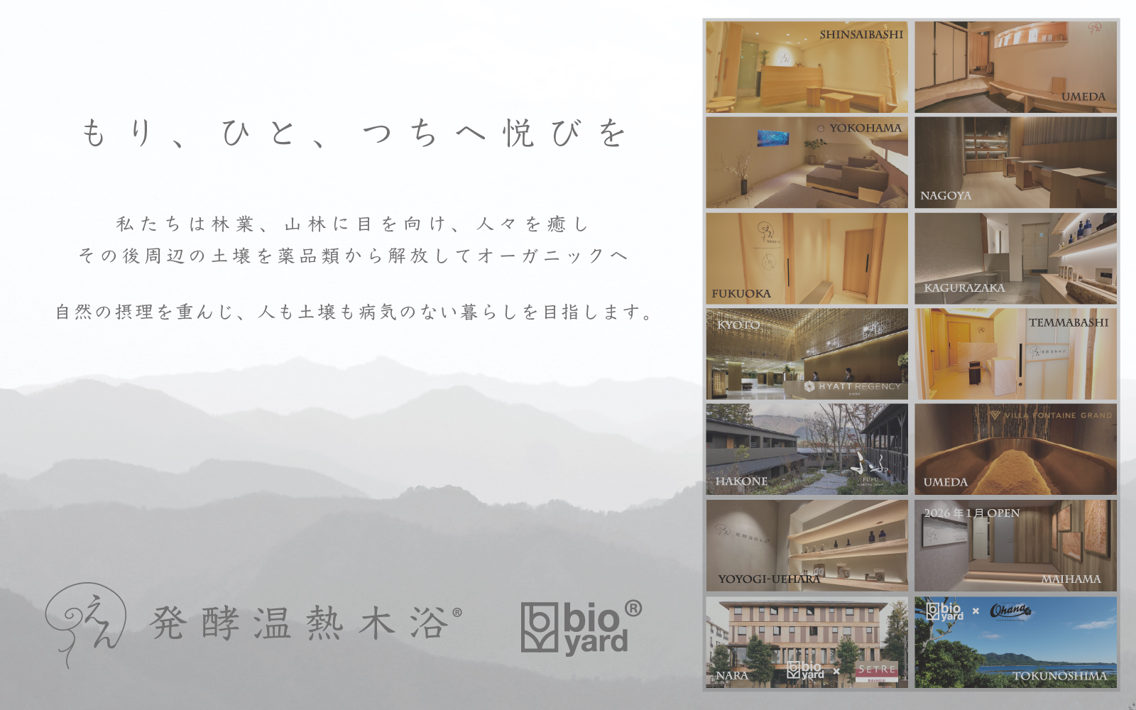 えん発酵温熱木浴で使用するヒノキパウダーは吉野をはじめとする日本各地の国産ヒノキを活用し、使用後は発酵堆肥として地元の農家さんと連携しながら、発酵の恵みを土へと還す取り組みを進めています。
