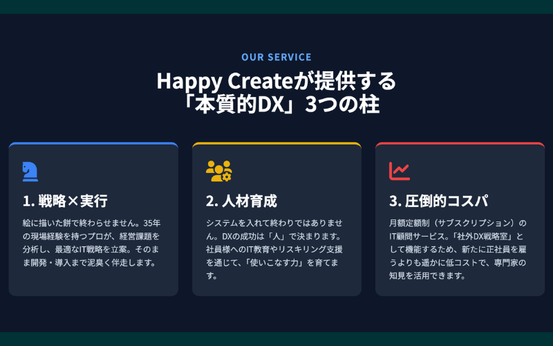 代表の私はIT業界一筋35年以上、累計で20年以上のシステム開発や15年以上のプロジェクトマネジメント、10年以上の新規事業立ち上げ、5年以上のDXコンサルティングなど、ITの全工程を泥臭く経験してまいりました。そして「こうした多種多様なITの経験を活かし、ITを通じて人々をもっと幸せにしたい」という強い想いから、「小さな幸せを創造する会社」として株式会社Happy Createを創業いたしました。以来、発注側と開発側の双方を知り尽くした現場主義の専門家として、一過性の流行に流されない本質的なDX戦略の立案やシステム導入を通じ、お客様の持続的な成長に全力で伴走してまいりました。