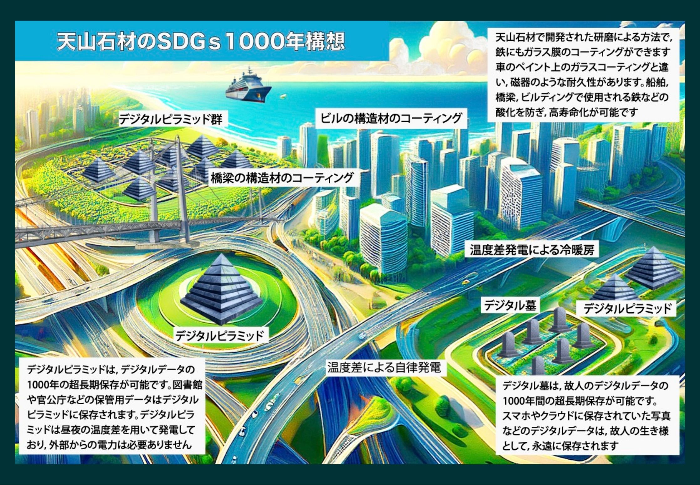 ピラミッドや日本の墓に代表されるように石は古来から、永遠の魂を伝えるための材料として用いられてきました。天山石材では,「天山石材のSDGs1000年構想」を掲げて、石材を使った未来構想を掲げております。天山石の長寿命性とIT融合化技術特許を利用したデジタルデータの長期保存技術、世界で始めて石材表面で強固なガラス膜作成する方法を発見し論文化、あらゆる材料をガラスコーティングし耐久性を高める技術を提案しております。