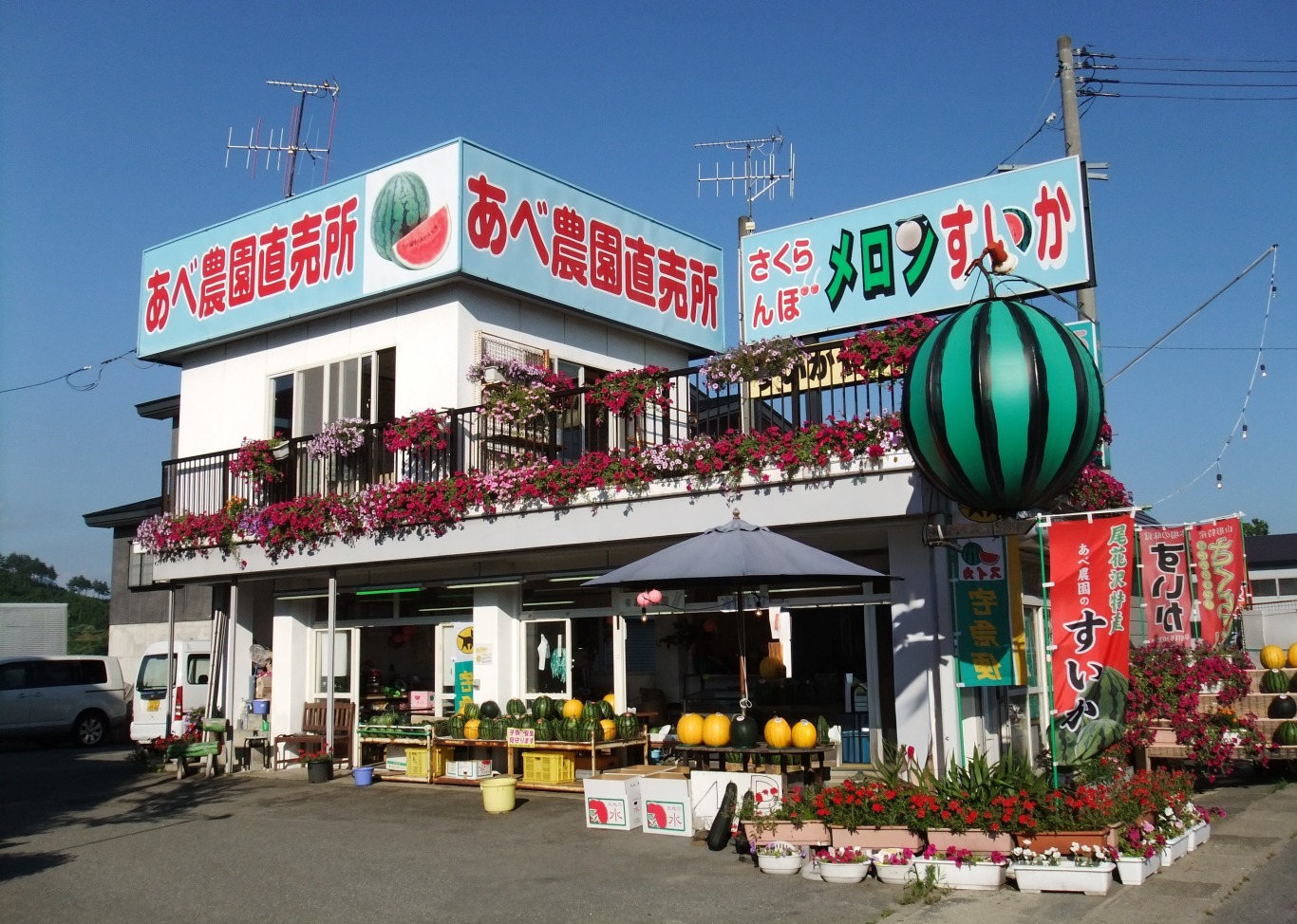 あべ農園の歴史は初代庄吉が戦後、国が奨励した未開拓地の開墾で鍬とスコップだけで原野を切り拓いたところから始まりました。川が遠く、陸稲や芋を育てる貧しい農家でしたが、2代目の良一は両親を助け中学生から懸命に働いたそうです。こうして購入した田んぼで生活できるようになった矢先、国の減反政策が下り、米に代わるものとしてスイカ栽培への挑戦が始まりました。1973年に初めて収穫できたスイカを市場に出しましたが、冷夏の影響で収入にはならず、その翌年も天候不順と当初はなかなか芽の出ない日々が続きました。「去年の二の舞か」と失望していたところ、「私が売る」と妻の敬子が言ってくれたことがきっかけで、世の中で直売所ブームが起こる20年も前に、間借りした駐車場の一角に張ったテントでまだ幼い息子の真一をおぶってスイカ販売を開始しました。これが「あべ農園直売所」誕生に至るまでの道筋です。