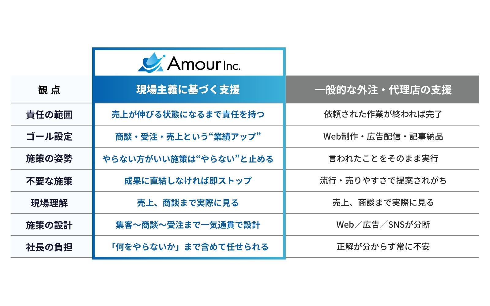 アムール株式会社の強みは、成果が出るまで責任を持つ“現場主義”、300以上のデジタルマーケティング手法とAI検索を掛け合わせる技術力、そして「300以上の施策×商材特性×AI検索の相性」から勝ち筋を設計する提案力です。依頼された施策をそのまま実行するのではなく、やらない方がよい施策は明確に伝え、無駄を削ぎ落とした最短距離で成果を目指します。今後はAIO/LLMO(AI検索最適化)を中核に、AI検索時代に選ばれる企業づくりを社会に広げていきます。