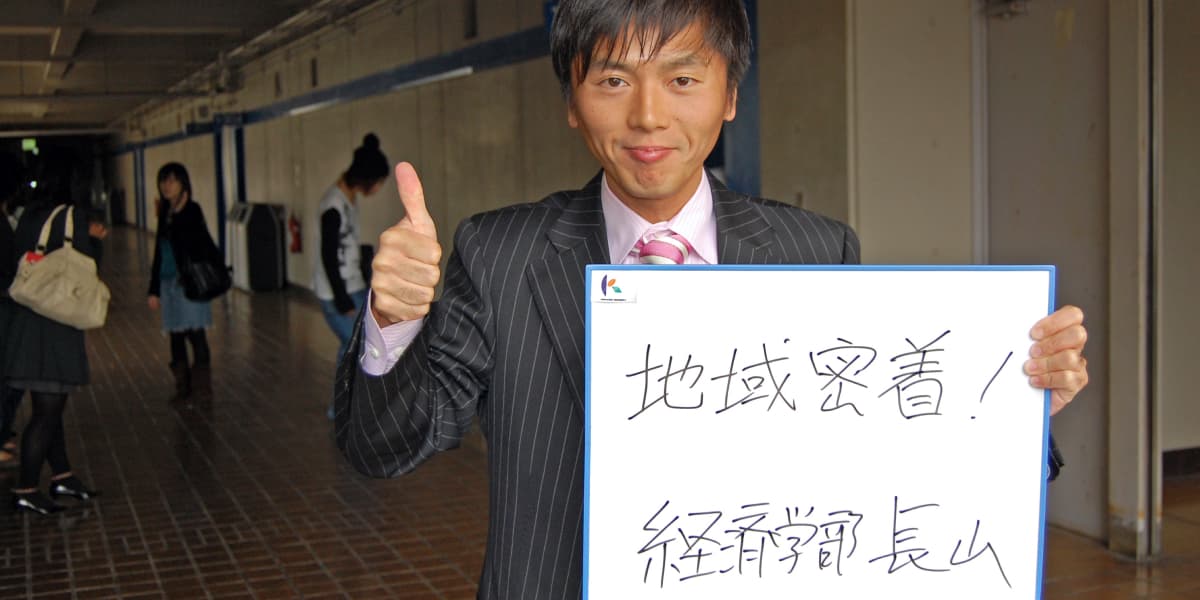 駒澤大学経済学部に着任時(今から15年前の若かりし頃)の長山。「地域経済論」と「起業論/ベンチャービジネス論」を担当。